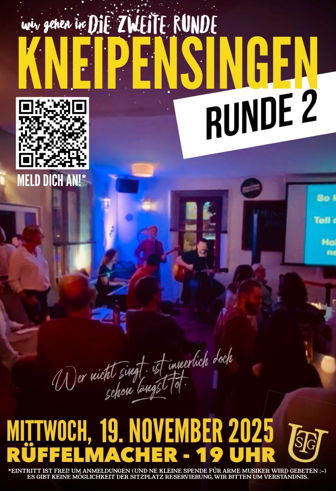 ⏰ Start: 19 Uhr – wir singen, bis die Stimmen versagen, die Stühle hochgestellt werden oder der Band die Noten ausgehen.